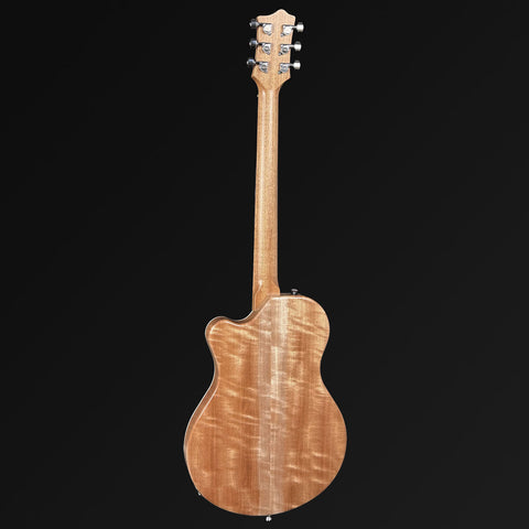 Using his Industrial Design background, Martin Pratley has developed the A-X top bracing pattern to prevent bridge roll (top belly-ing) while enhancing the articulation and sweetness of tone. The bracing is also made from premium quarter sawn Bunya and is designed in a way that improves resonant transfer between the top, sides & back. The backs also have a 4.5M radius dome joined with the sides using their proprietary laser kerf linings.